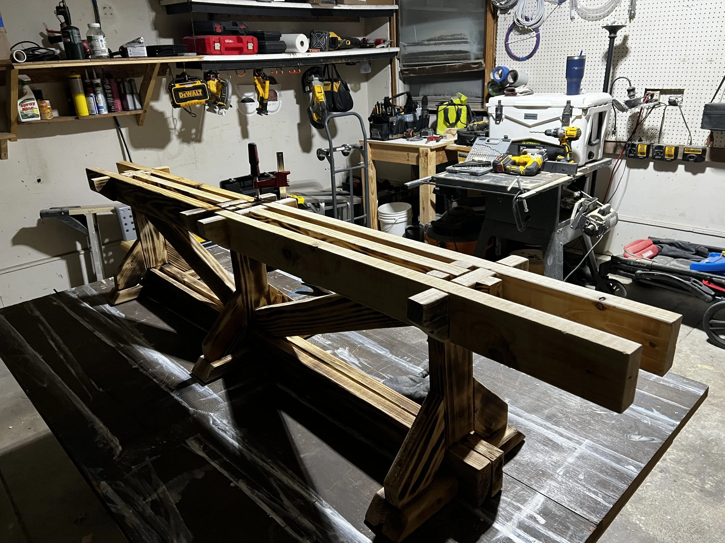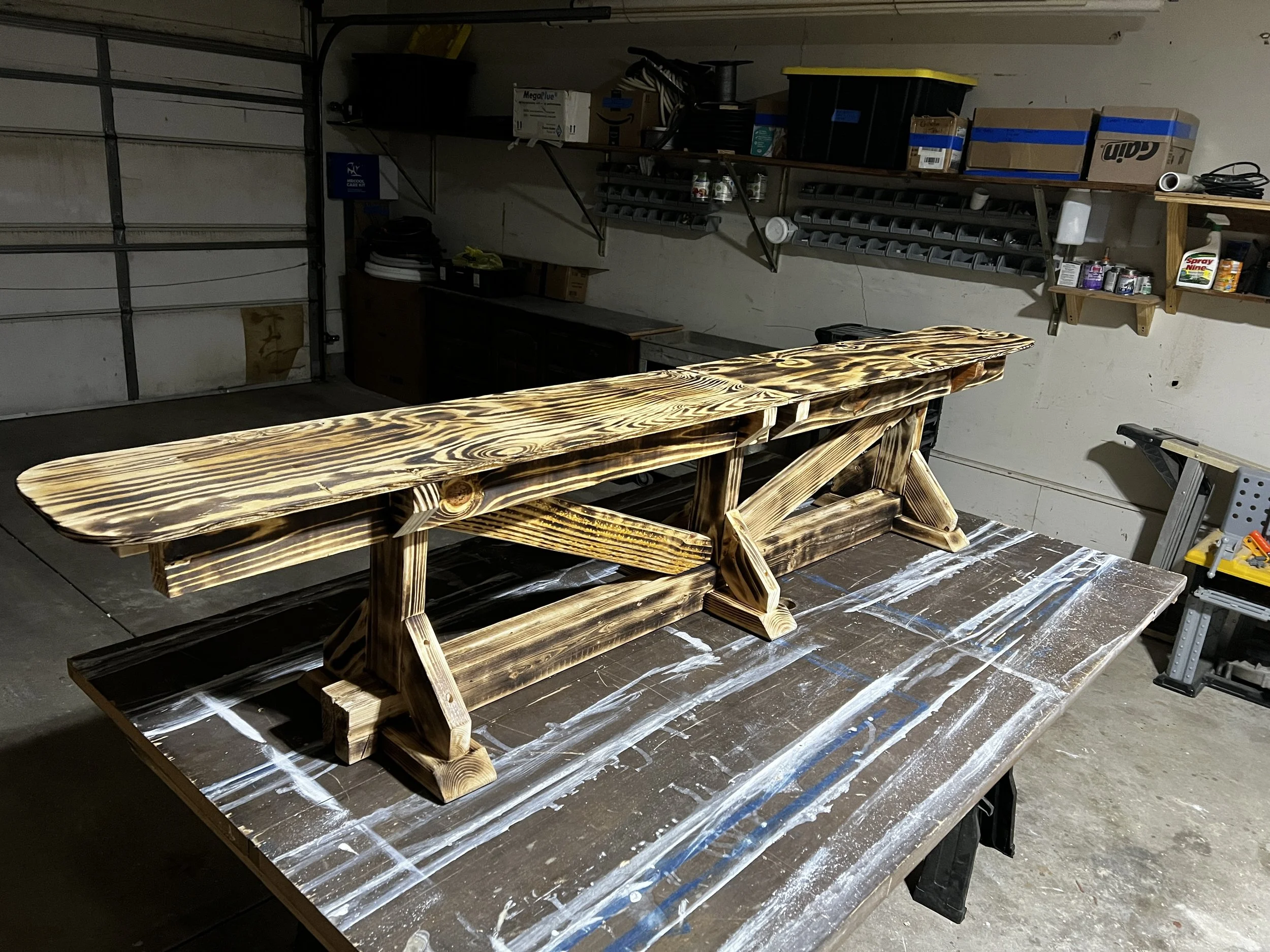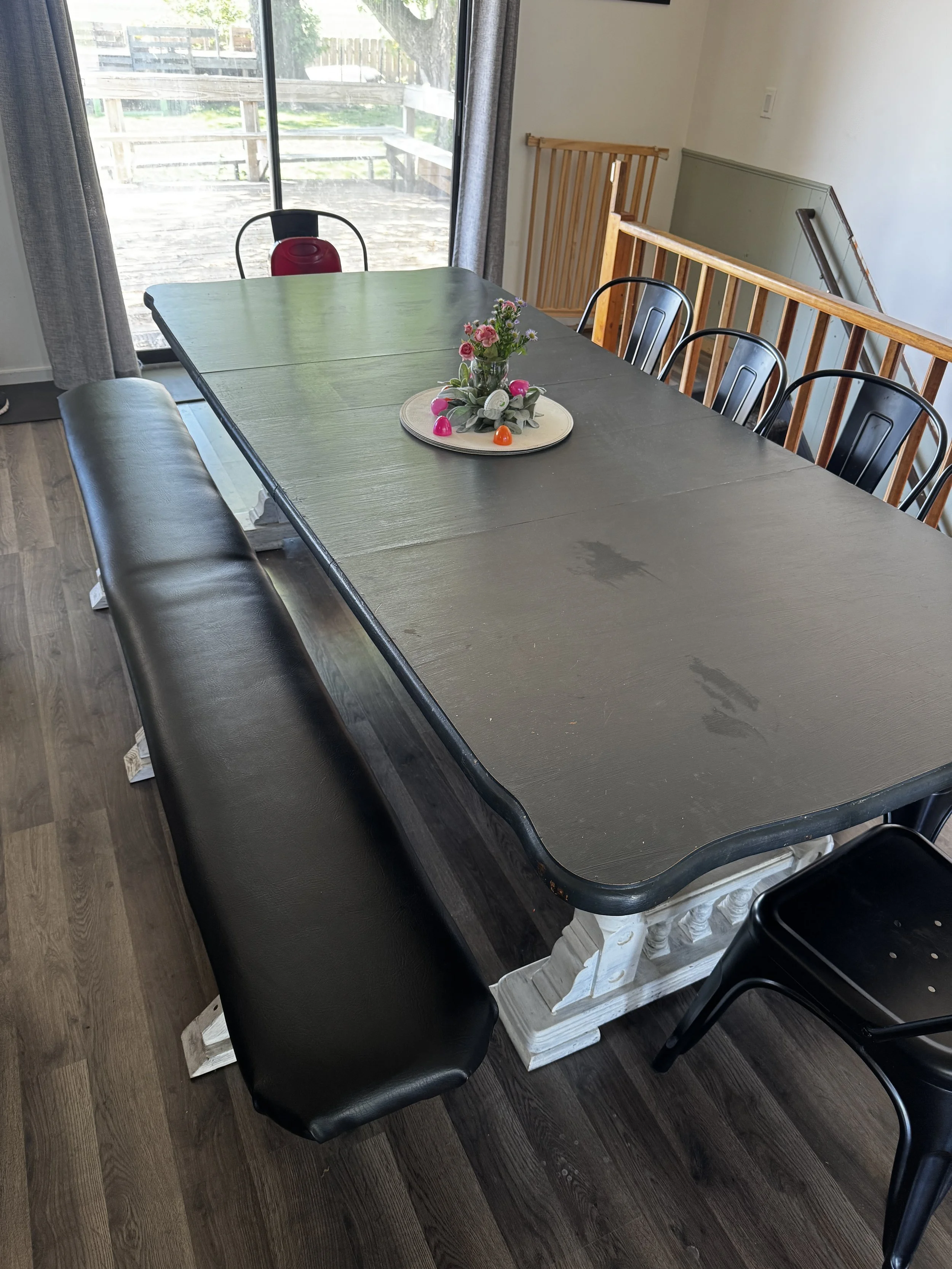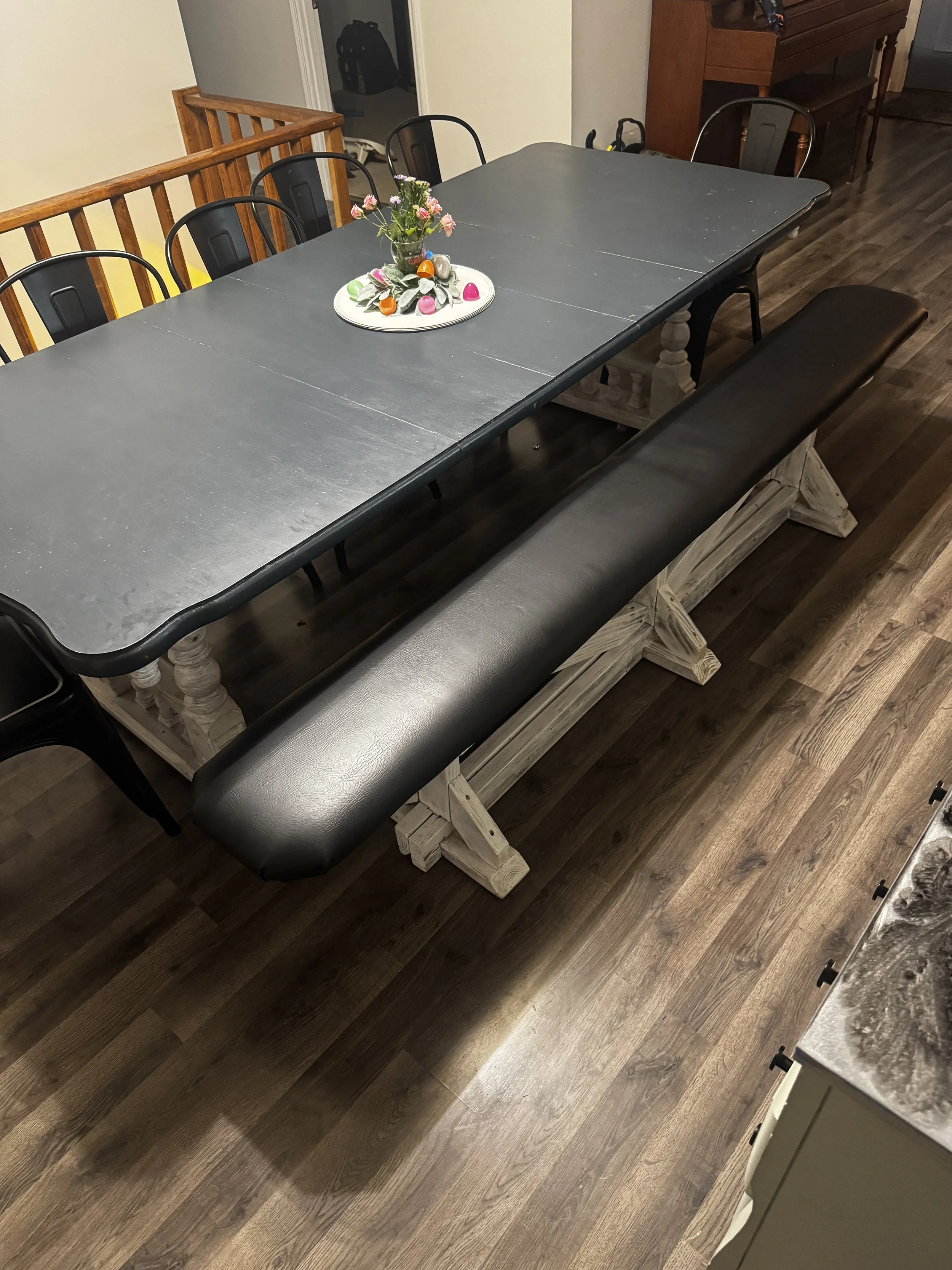 A We had a customer looking to add more seating to their table, but wanted to avoid bulky chairs on one side of the table that obstructed the walkway when no one was sitting there. So we made this custom length bench with overhangs to go the length of the table, but with a main frame just the right size to tuck under the table when not in use. The vinyl-wrapped cushion also makes cleanup from dinner messes a breeze!