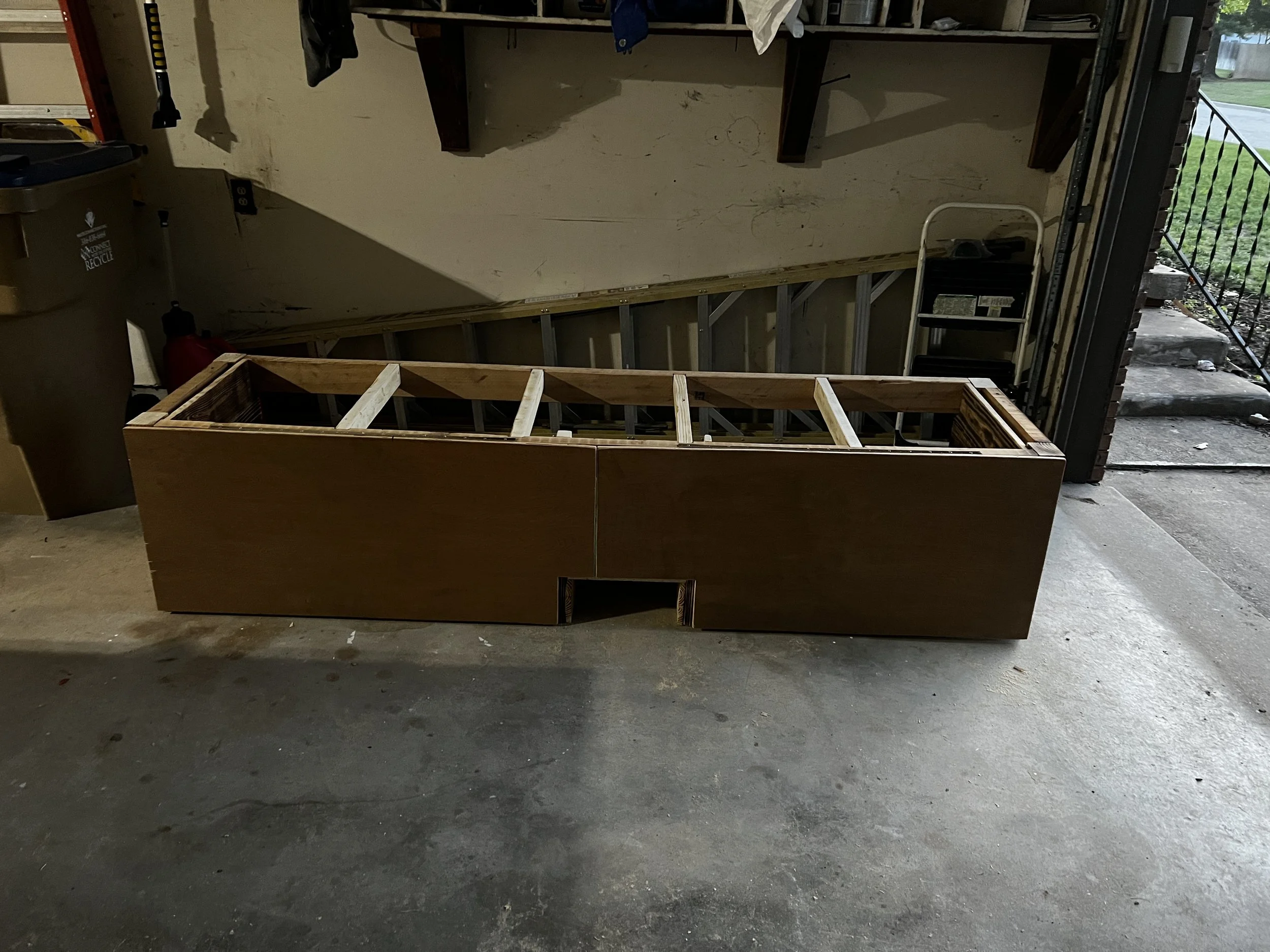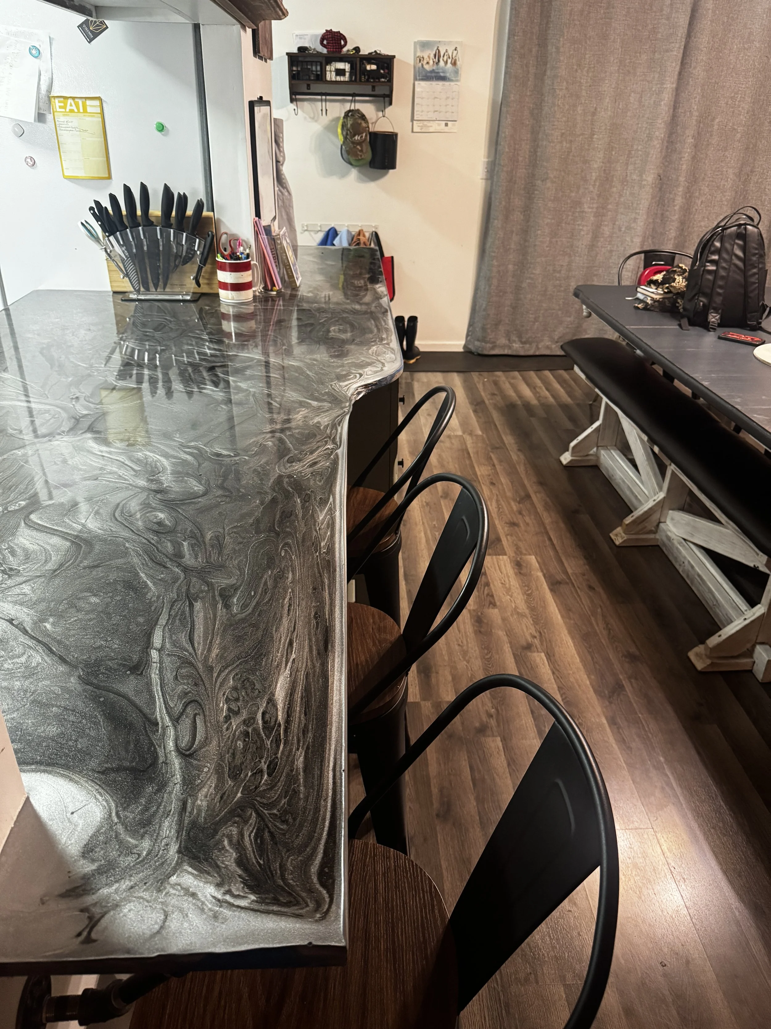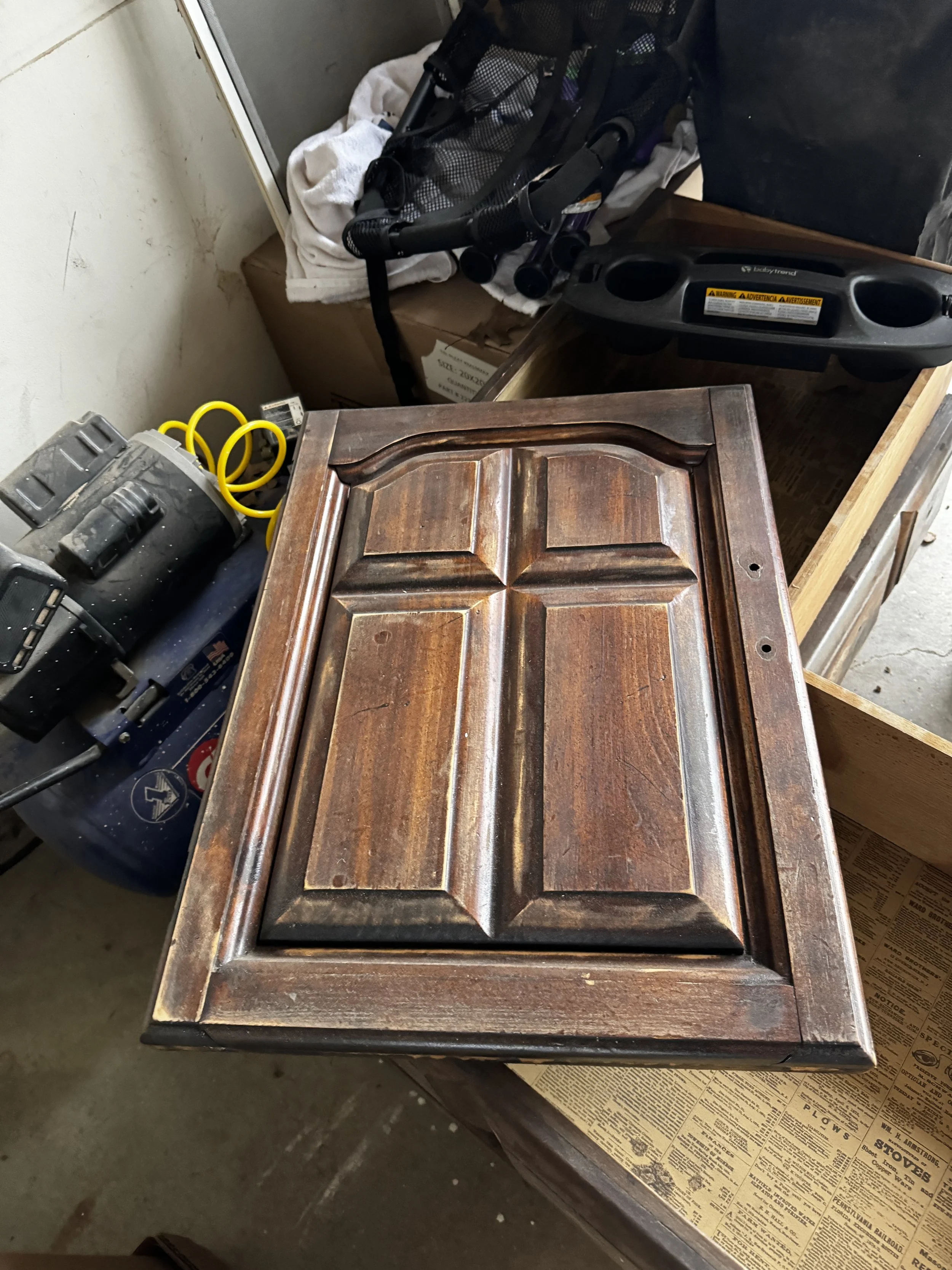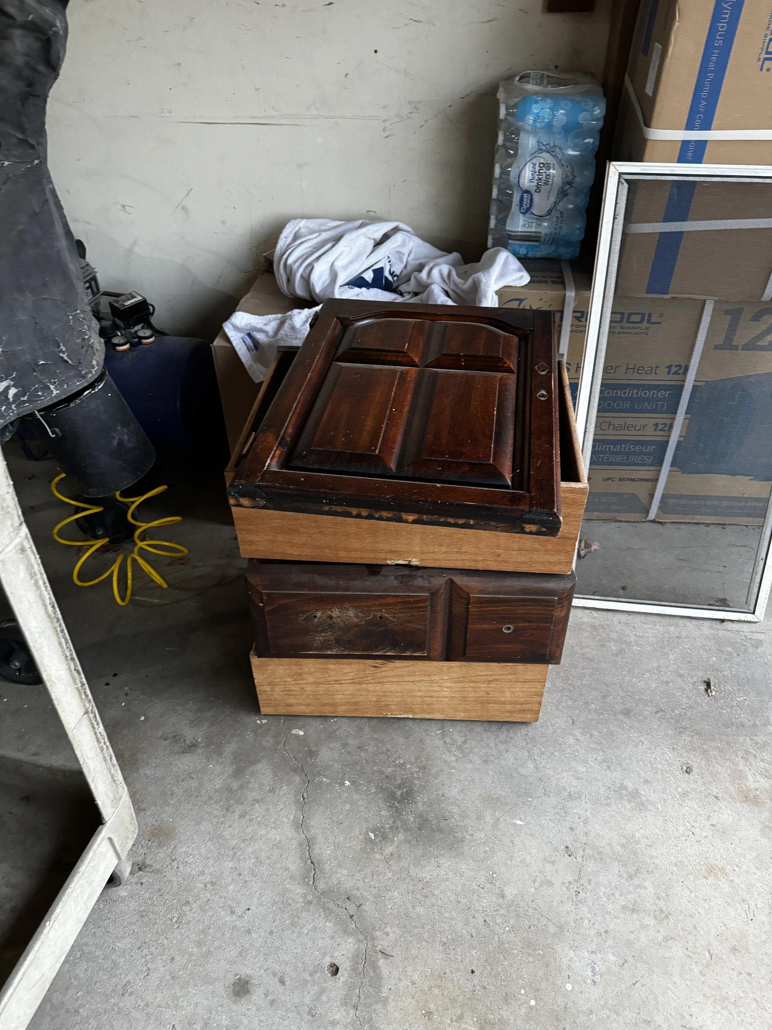 We found this old chest on a curbside to be thrown out. We snagged it before it could be pitched, and are glad we did! We removed the existing top, sanded all the doors and drawers, patched holes and got new hardware, raised the height with a lower shelf and legs, made a completely new top at the exact height of the kitchen counters, and poured an all-new epoxy counter on the entire kitchen.