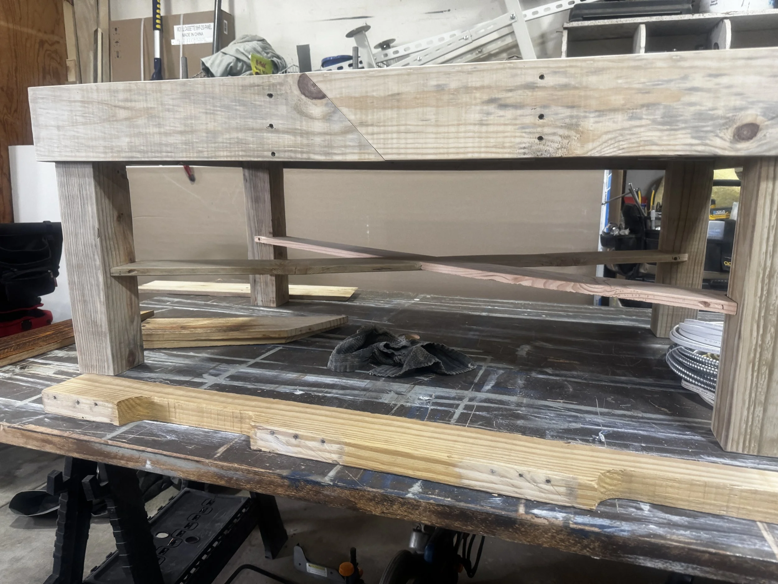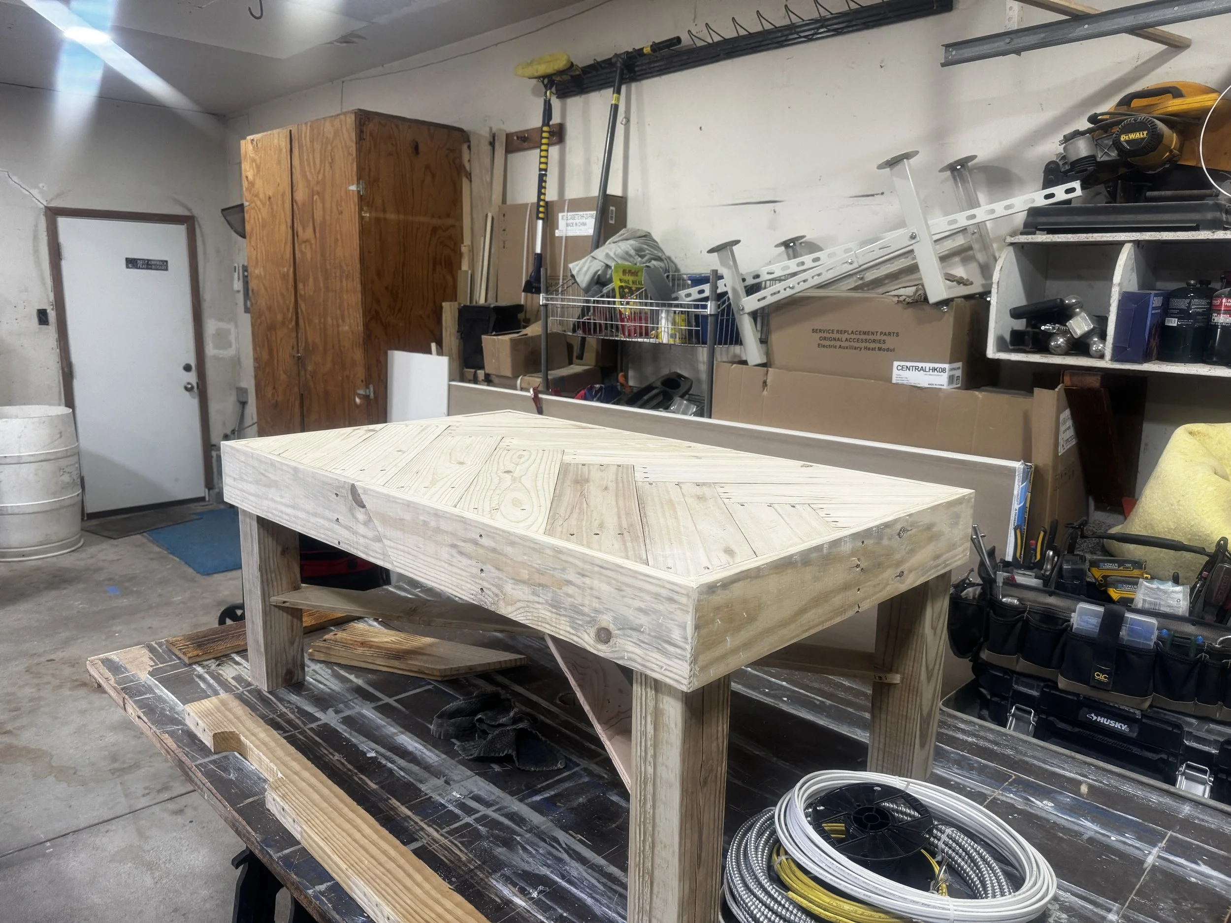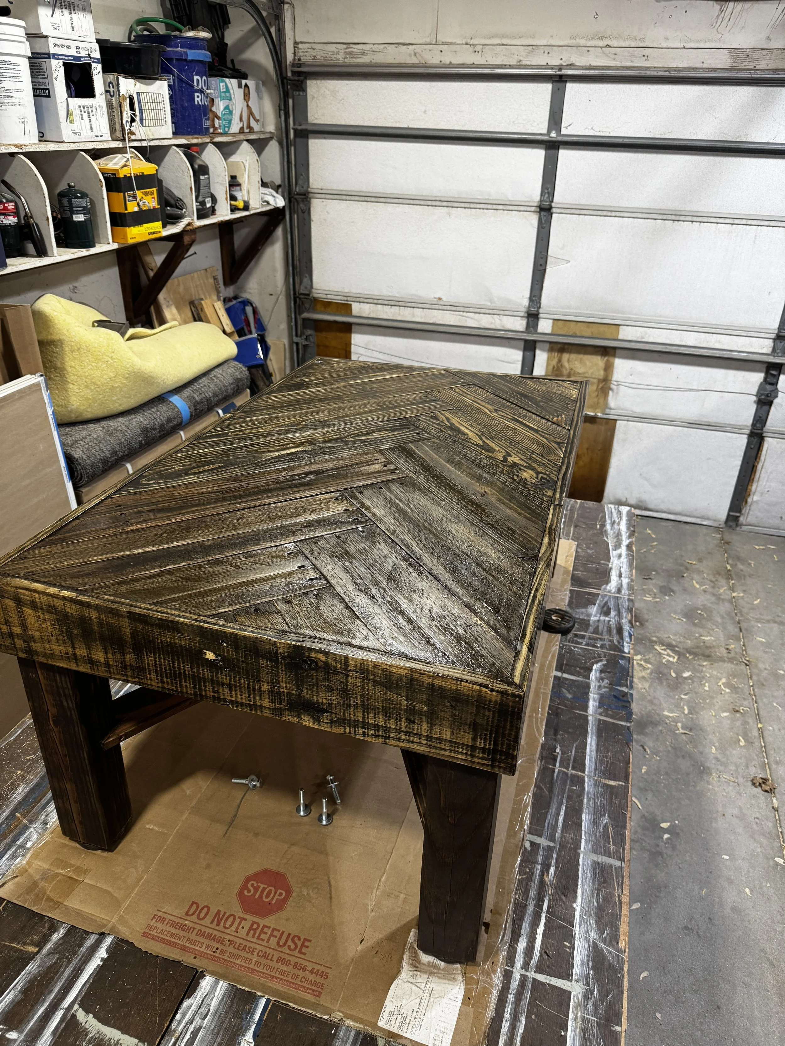 A customer contacted us looking for a rustic farmhouse coffee table. We utilized reclaimed & upcycled wood to construct this indoor/outdoor herringbone coffee table with a deep brown tone, a clear waterproof & weatherproof coating, sturdy 4x4 post leg construction, and adjustable feet for easy leveling on uneven surfaces