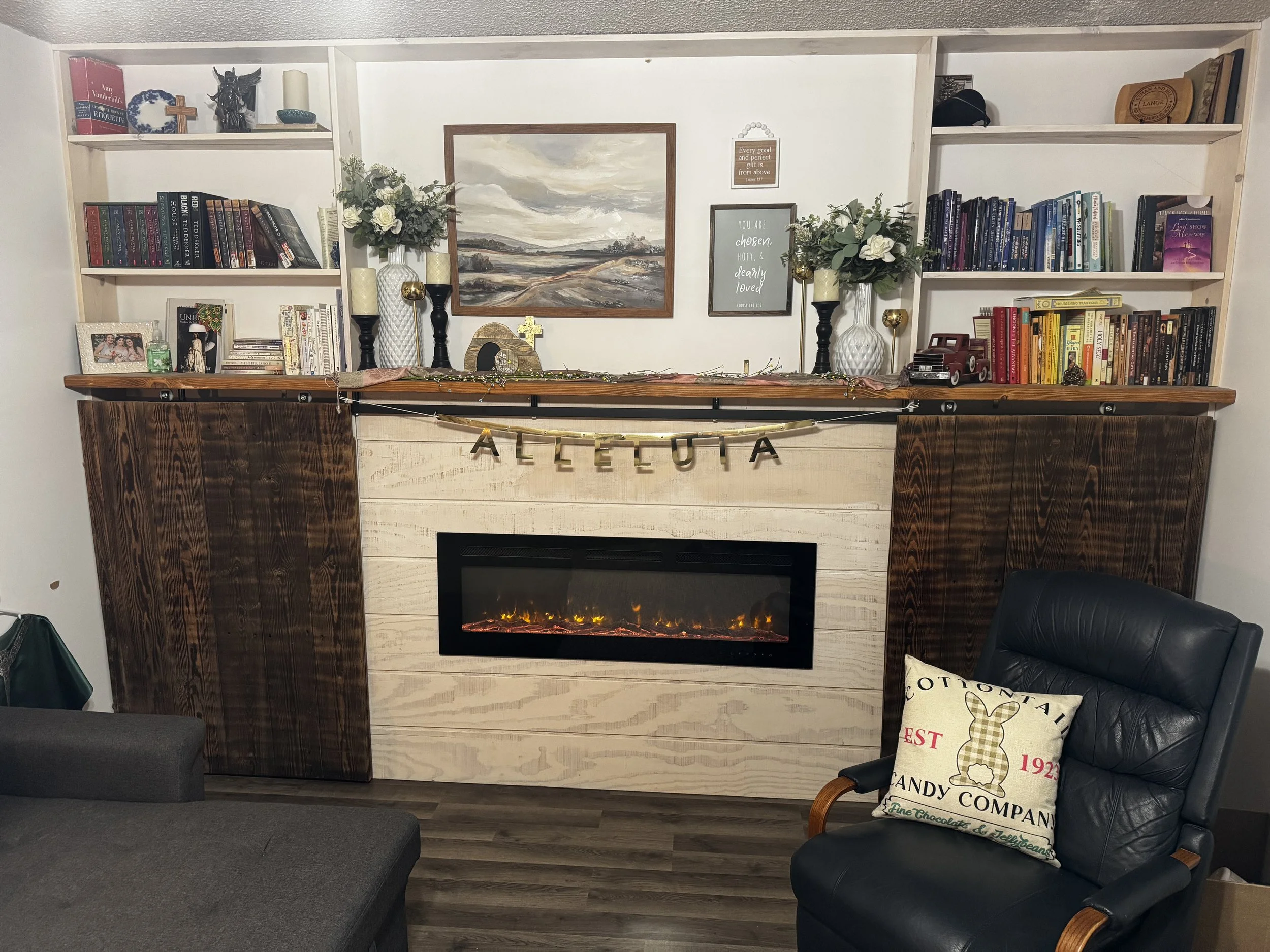 Have you ever had an empty wall that you weren’t sure what to do with? We helped this customer design a set of full-wall built-ins for additional storage, with an aesthetic faux fireplace and sliding barn doors made from real locally-sourced barnwood. The fireplace even changes colors for matching with seasonal decorations.